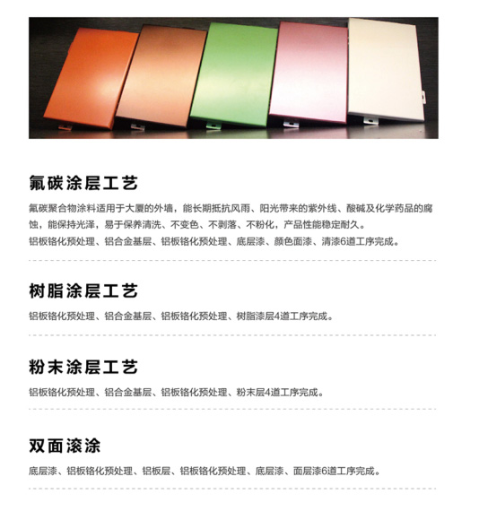 氟碳鋁單板涂層均勻,顏色豐厚多樣,另備有仿木織和石紋可供挑選,豐厚的顏色可供設計師充分發揮無限的幻想空間。慣例厚度有:1.5mm、2.0mm、 2.5mm、3.0mm、3.5mm、4.0mm。